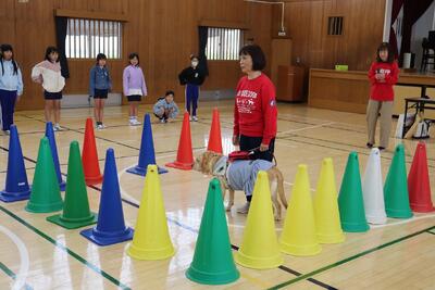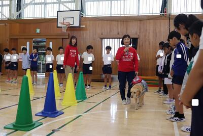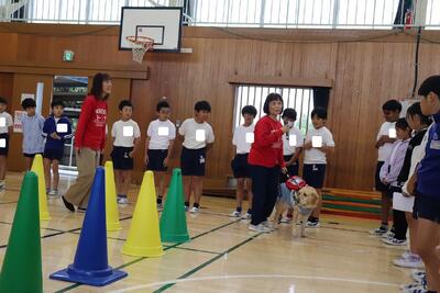4年生は高齢者疑似体験に続き今日は盲導犬ユーザーの方をお招きして、盲導犬との生活の様子を聞いたり、盲導犬が実際にどのような役目を果たしたりしているのかなどを学習しました。デモンストレーションでは、英語の指示に従って盲導犬が真っ直ぐ歩いたり、右に曲がったりする様子を観察しました。また、障害物や危険を知らせるために、盲導犬が体全体を使ってユーザーを守る様子も分かりました。大切な方を守るため盲導犬は一般に大型犬であることもよく理解できました。