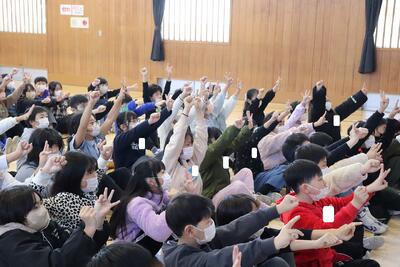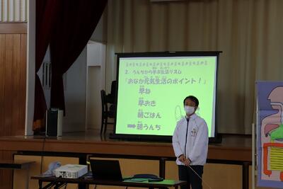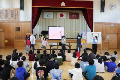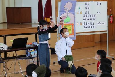 株式会社ヤクルトさんの出前授業で、4,5年の児童を対象に「おなか元気教室」を行いました。まずはじめにおなかの中にある小腸や大腸の働きについて説明をしていただた上で、おなかがいつも元気になるためには生活リズムが大切であることを教えてくれました。またうんちの形は健康のサインであり、うんちが出ないと体の中にある悪い菌が排泄できないことに繋がってしまうことも知りました。「早寝、早起き、朝ご飯、朝うんち」ができる生活にしようと一人一人が目標をもつきっかけをとなりました。