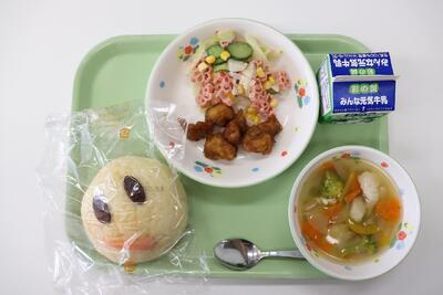 (鴻巣ひなちゃんパン・豚肉と鴻巣なしのきらめきソース・コスモスサラダ・彩り野菜スープ・牛乳)