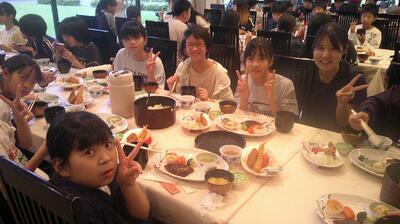 食堂で朝食をとりました。昨日、キャンプファイヤーを全力で踊りきったのでしっかり食べている様子がありました。